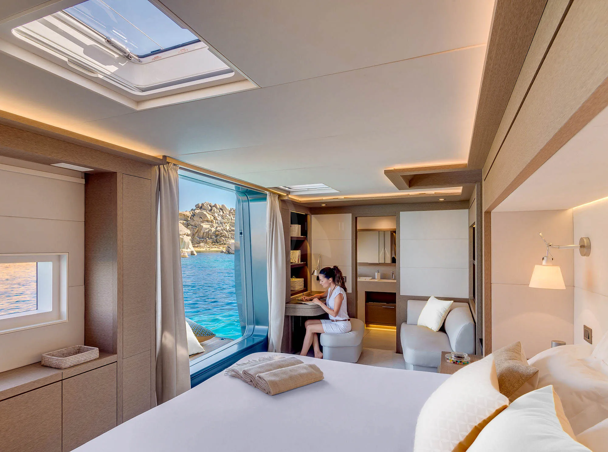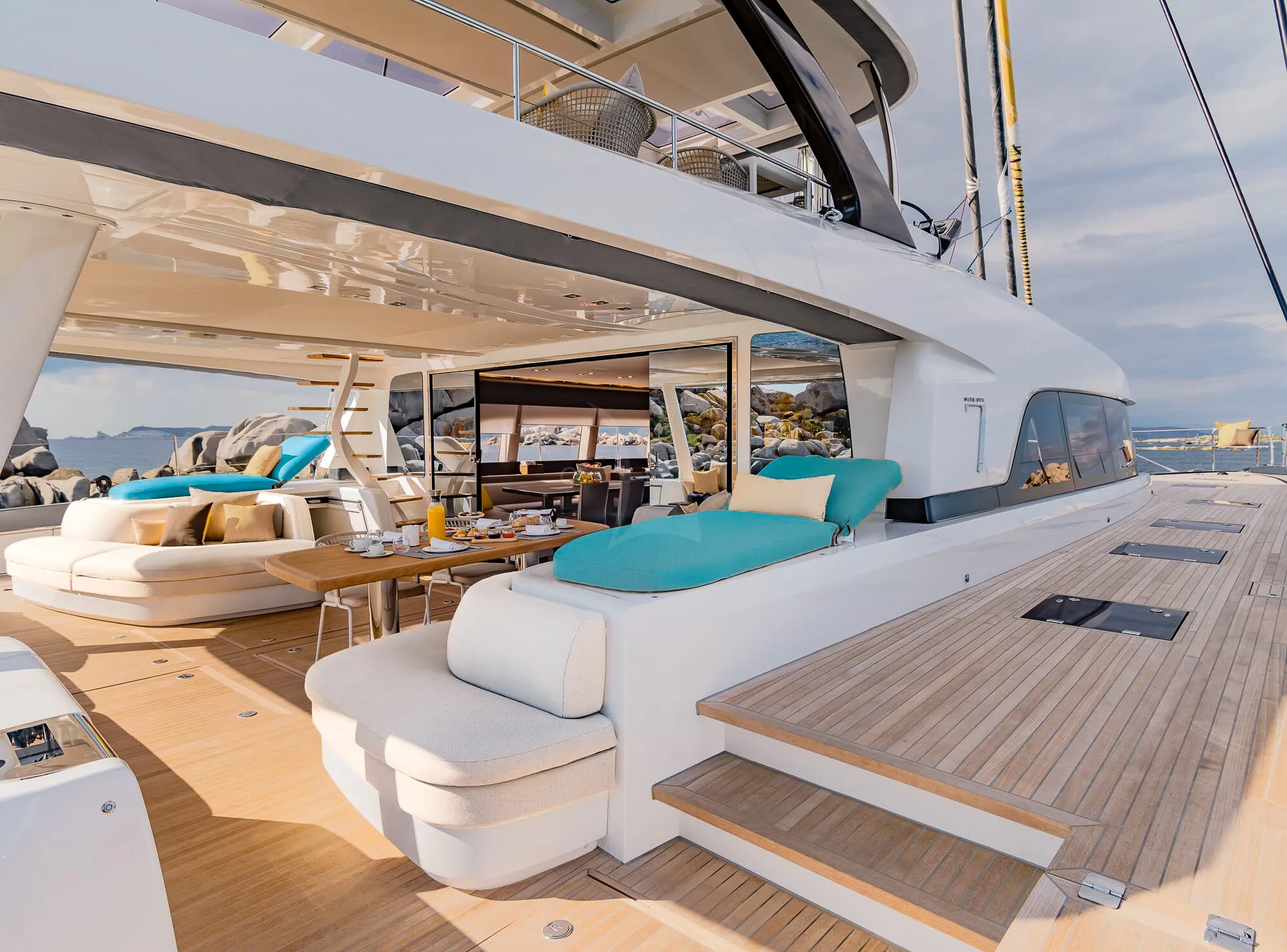 This superb Lagoon was launched in 2023 and accommodates up to 8 guests in 4 cabins. Built using the Seventy 7 forward galley configuration, amenities onboard are perfectly geared towards charter getaways for all the family. With ample deck space, panoramic views forward and aft and an incredible swim platform for fun in the water, J. SPARROW is an adventure not to be missed. Onboard amenities include a main salon with lounge and dining area, an incredible Cockpit with panoramic views and seating forward and aft and a flybridge with additional lounge and dining. J SPARROW is stocked with a selection of toys including Seabobs and an electric foil board. She is also equipped with air conditioning and WiFi throughout.