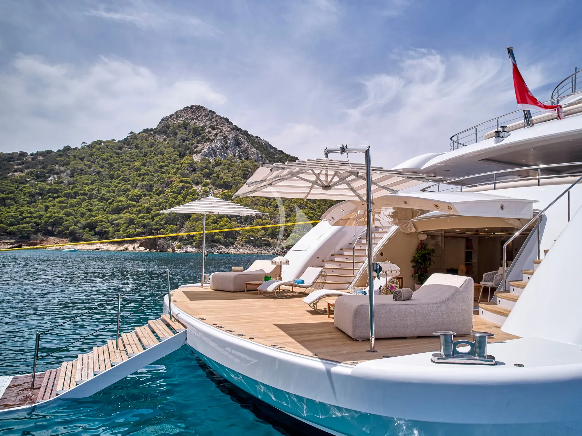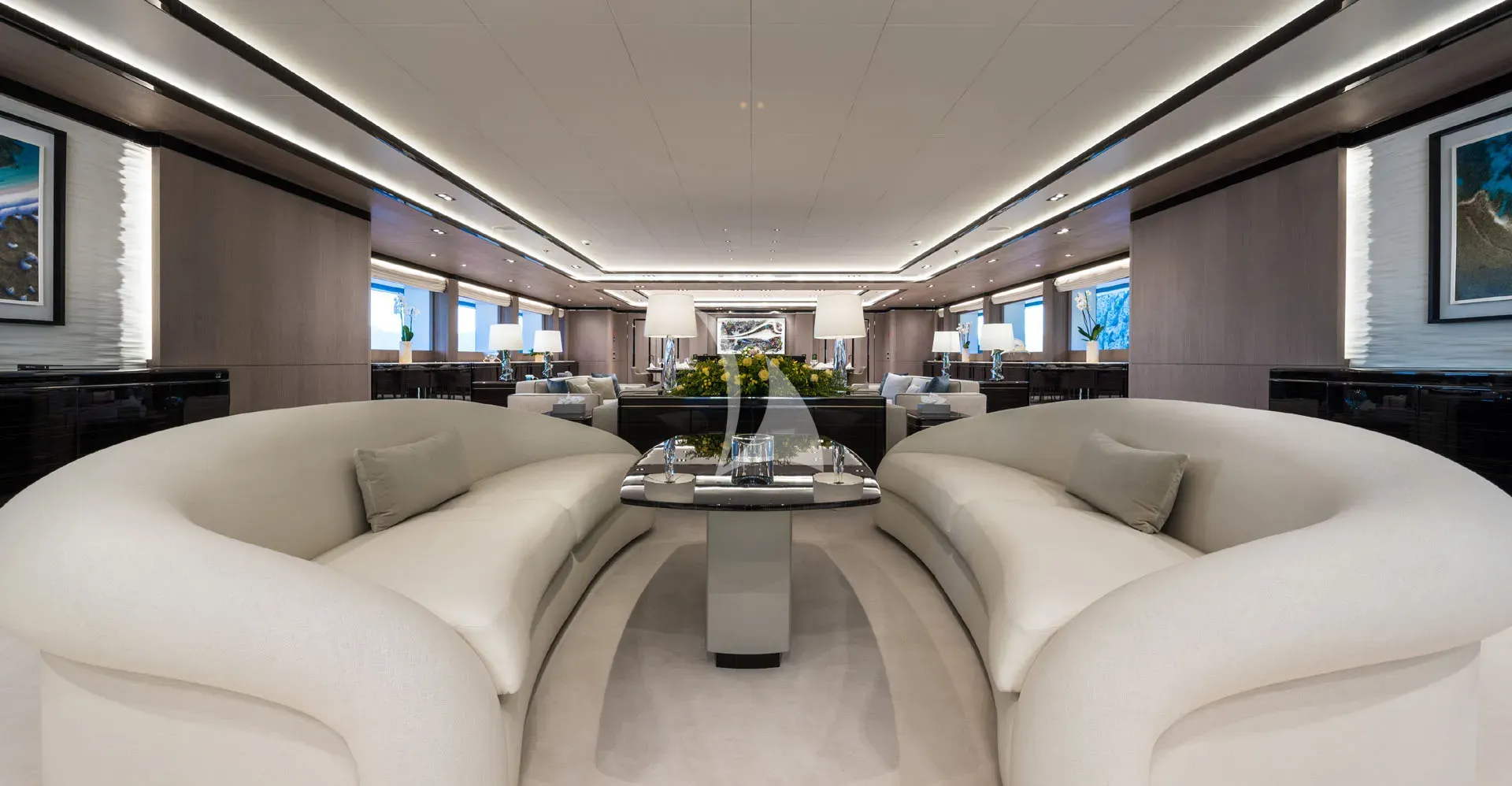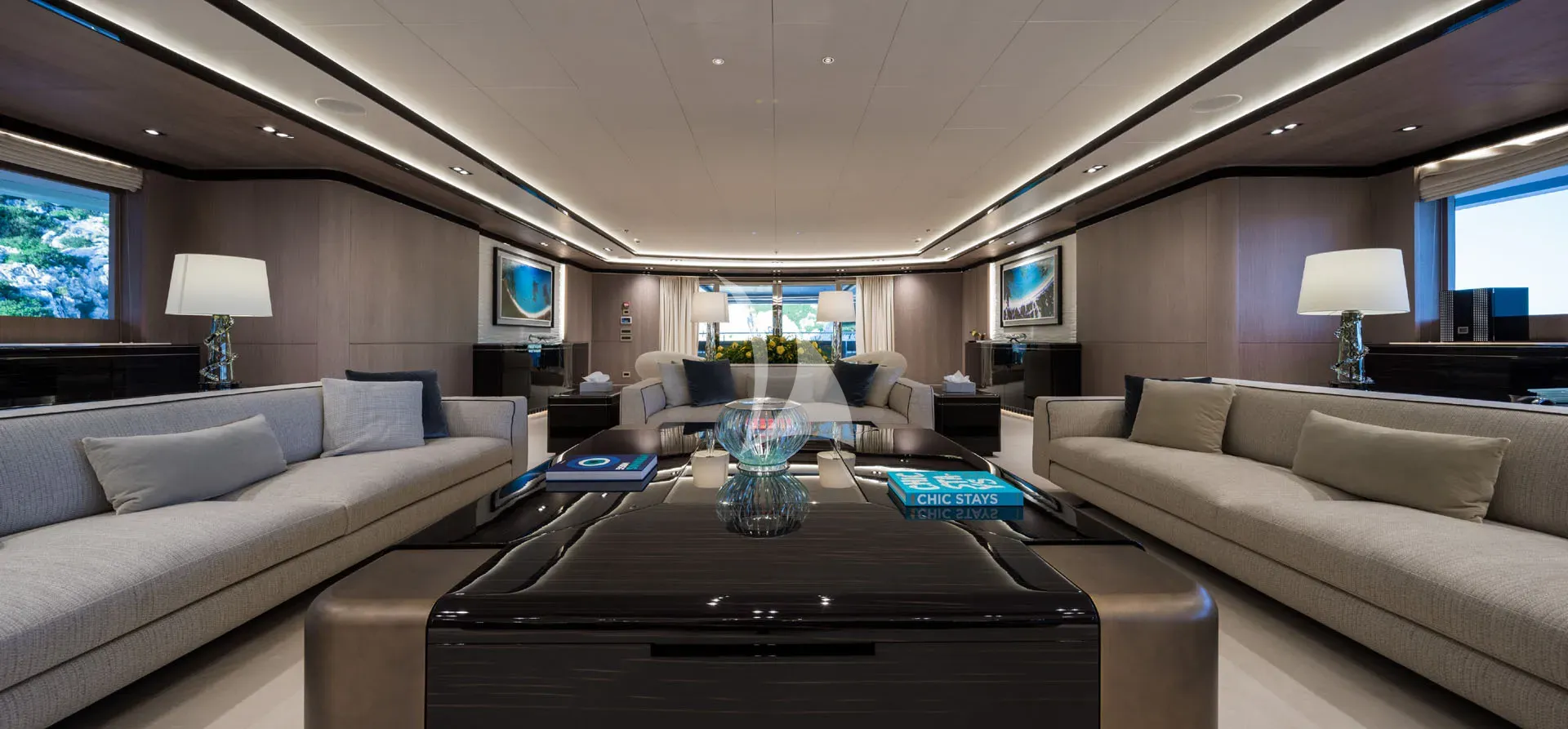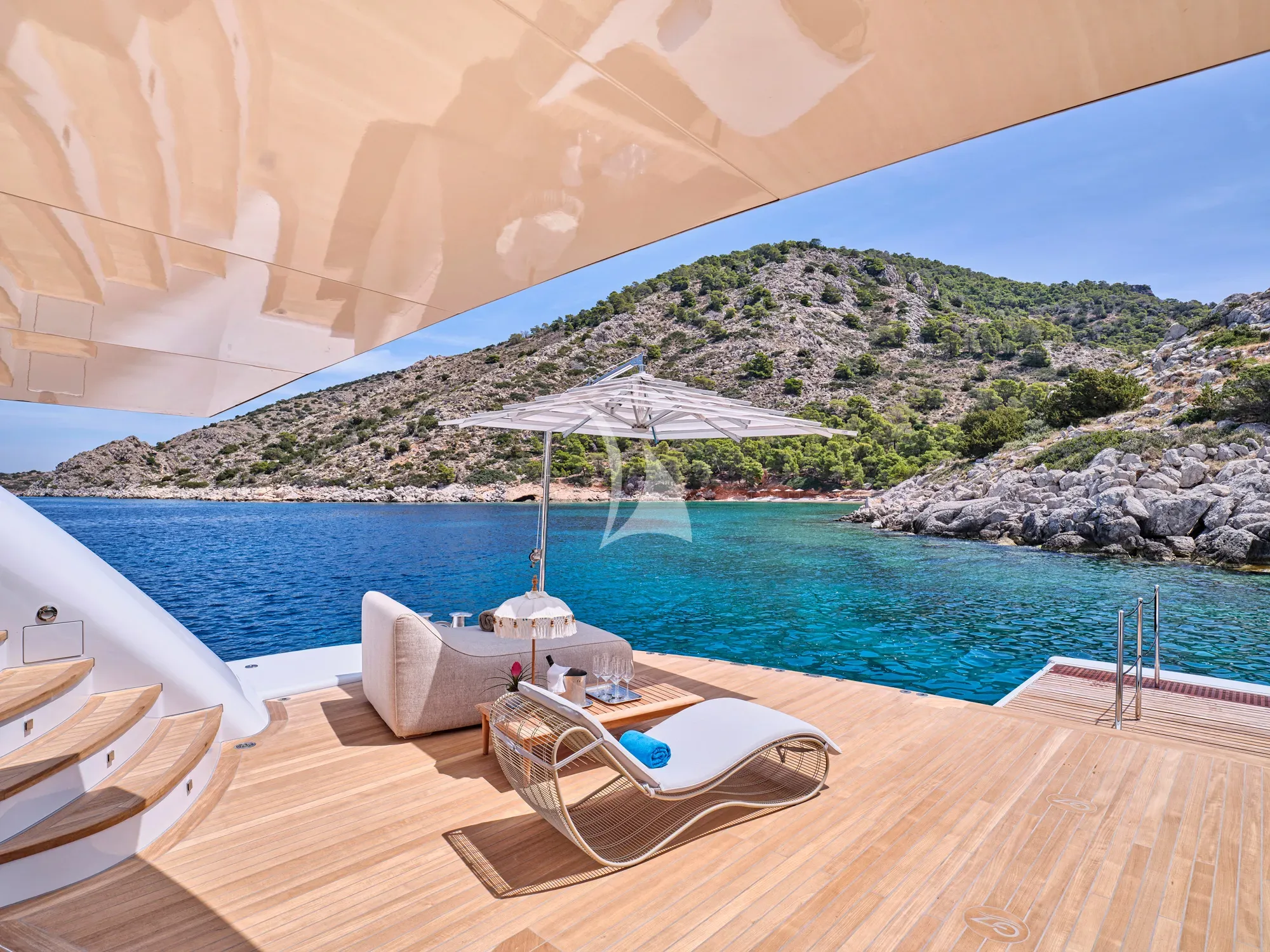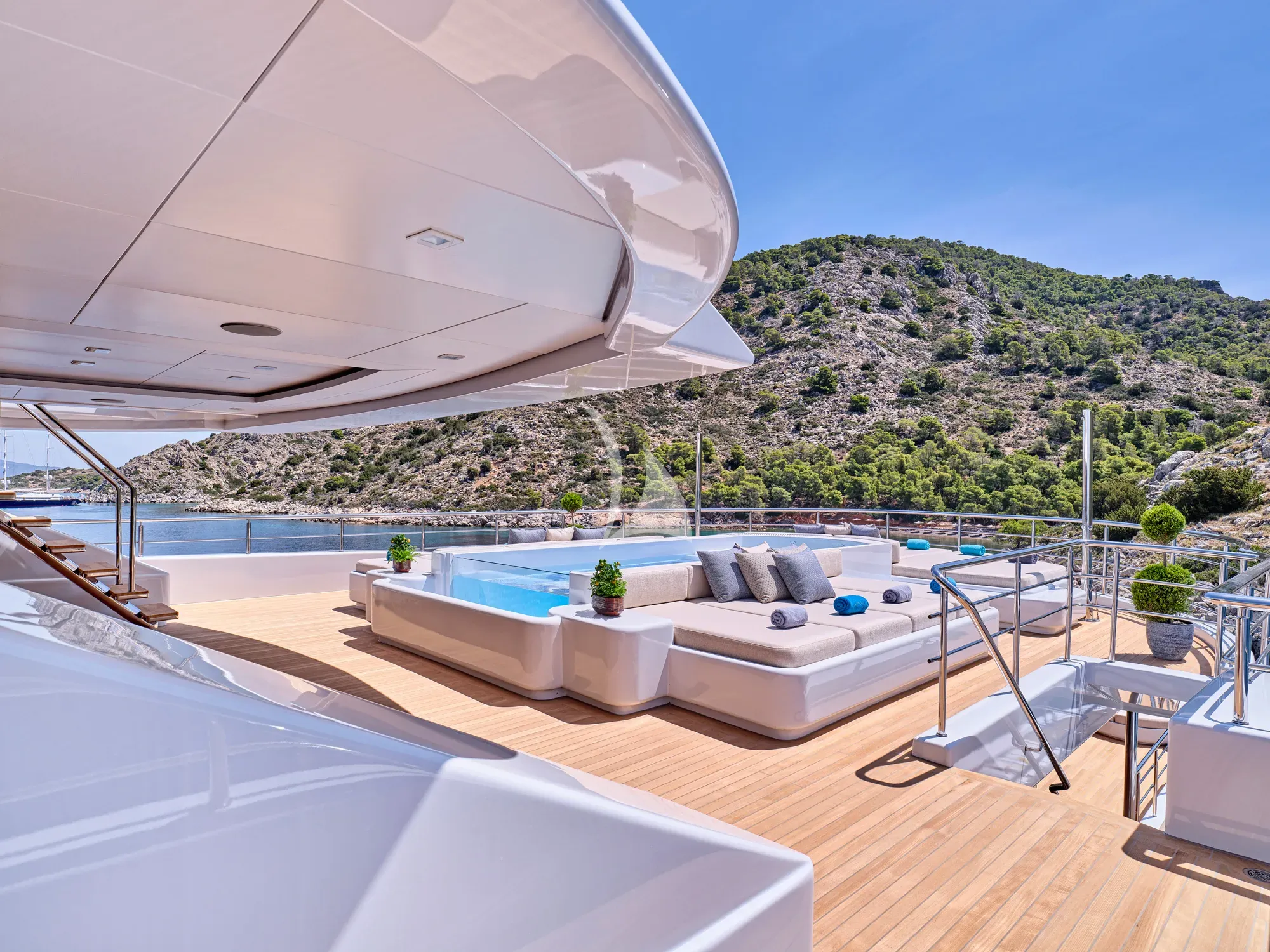 The yacht’s interiors are a study in opulence, harmoniously fusing state-of-the-art audiovisual technology with meticulously designed living spaces. Outdoors, a cinema on the sundeck and a hot tub encircled by a sunbathing area invites guests to relax and revel in the joys of open-air living.