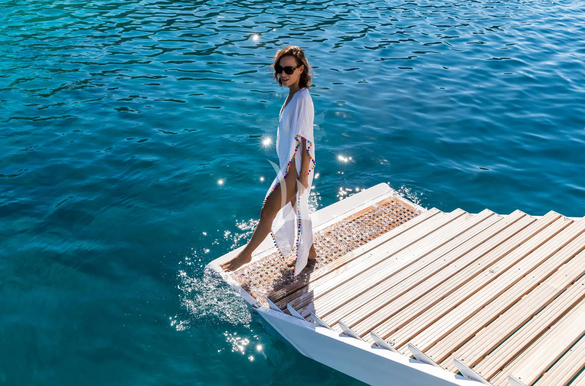 Exceptional versatility marks O’PTASIA’s design. The beach club at sea level is equipped with a bar, a massage area, and a steam room. Accessibility is also at the forefront with a hydraulic ladder designed for guests with movement impairments and an elevator that serves from the lower to the bridge decks.