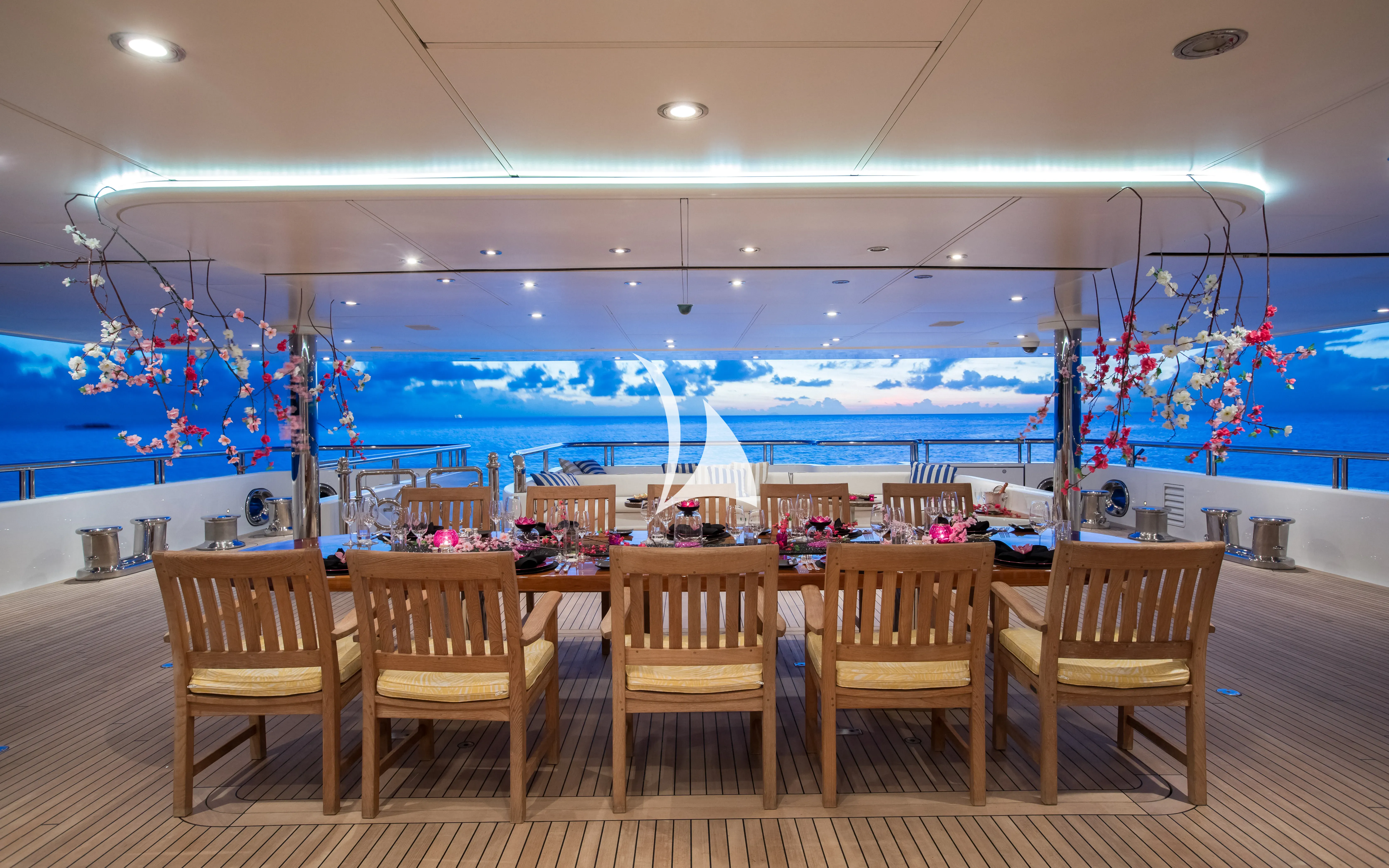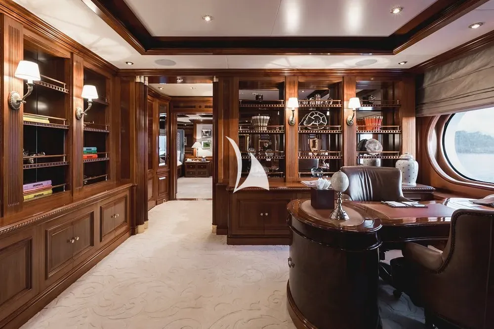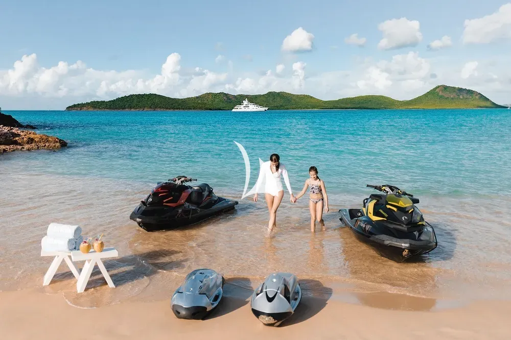 TITANIA has guest accommodation in 7 fantastic cabins, including two master suites, one on the main deck with a private jacuzzi bath and the other is an impressive newly installed second master suite on the upper deck with a panoramic sea view. TITANIA also has a VIP Cabin on the bridge deck plus four double cabins on the lower deck. There is an elevator going from the lower deck to the pool deck. She has a fully equipped gym on sun deck with fitness instructor and a beach club with sauna which can be converted into a night club. There is also a massage room & beauty salon with on board masseuse and beautician, glass gym with panoramic views and a personal trainer and large jacuzzi with swim-up bar. TITANIA is a certified RYA Training Centre and has two Jetski instructors able to issue jetski licences. TITANIA can host a maximum of 200 quayside guests for event charters.
