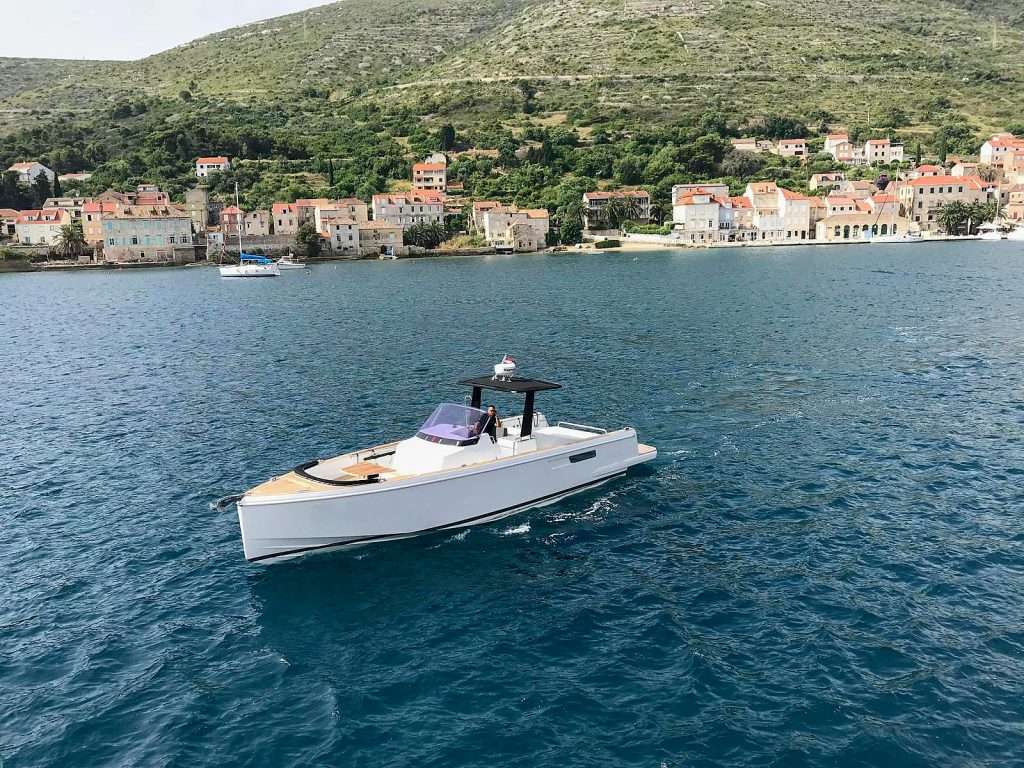 Her clean, well-balanced exterior lines and thoughtfully arranged spaces suit both cruising and relaxing at anchor, whether operating independently or alongside a larger mothership. The cockpit provides a generous, sociable living area with an ergonomic helm station and excellent visibility, complemented by sunbathing areas at both bow and stern that reinforce her true dayboat character. Below deck, space is optimised to include a cabin and separate bathroom, full of natural light.