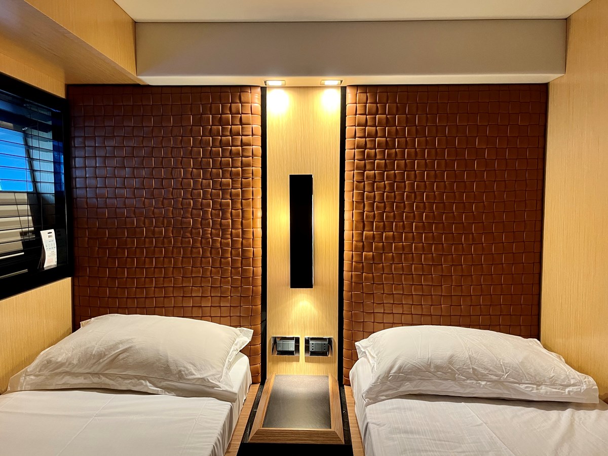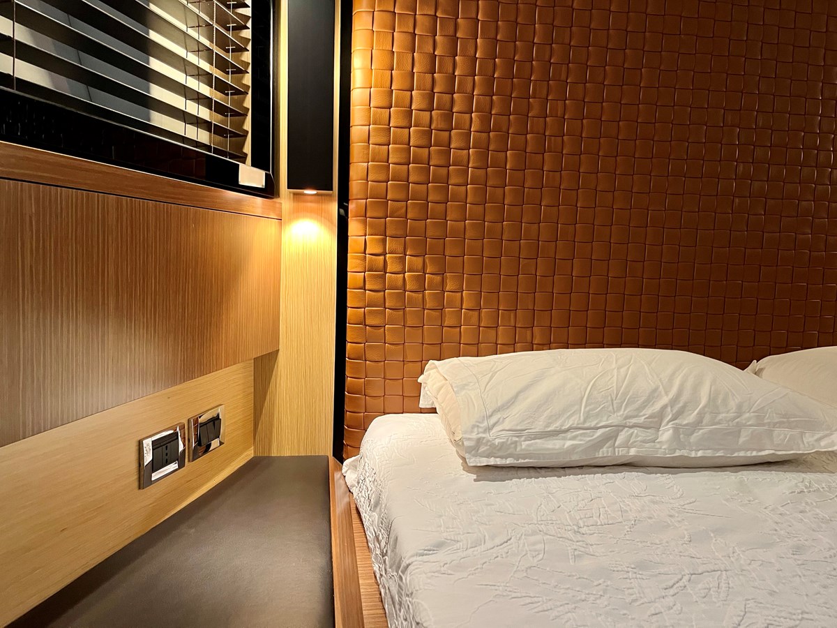 The lower deck offers a luxurious sleeping area, featuring a full-beam master cabin, a VIP cabin with a king-size bed, and a guest cabin with twin beds. Each cabin is beautifully appointed with smart layouts to ensure maximum comfort and privacy. The guest bathroom is accessible from the corridor, ensuring practical and functional accommodation.