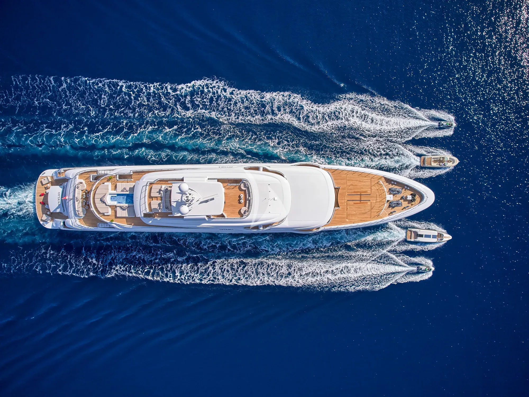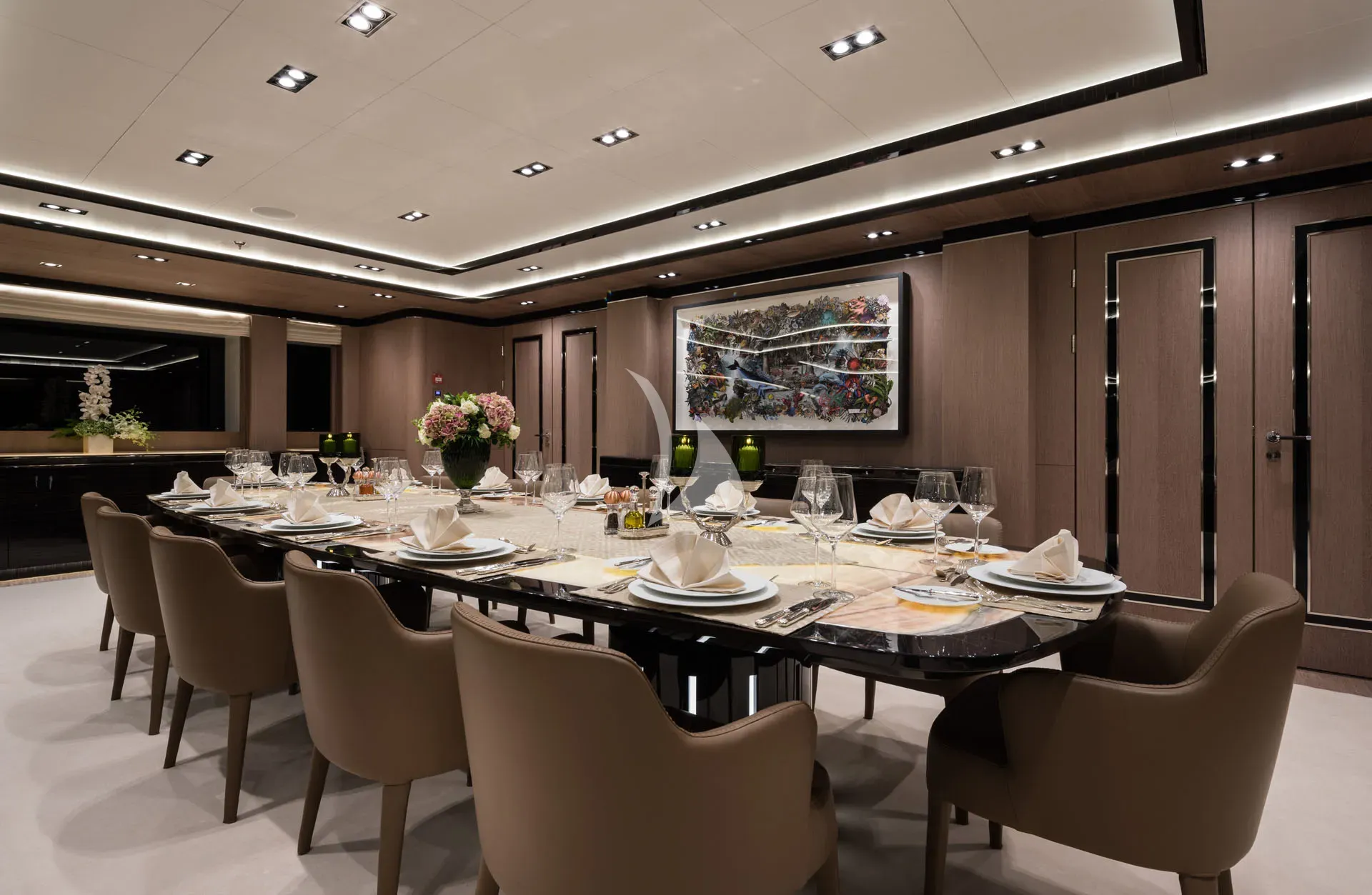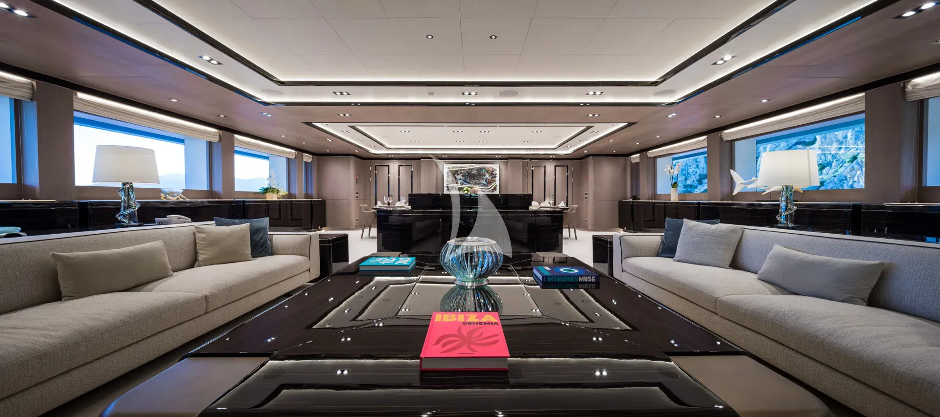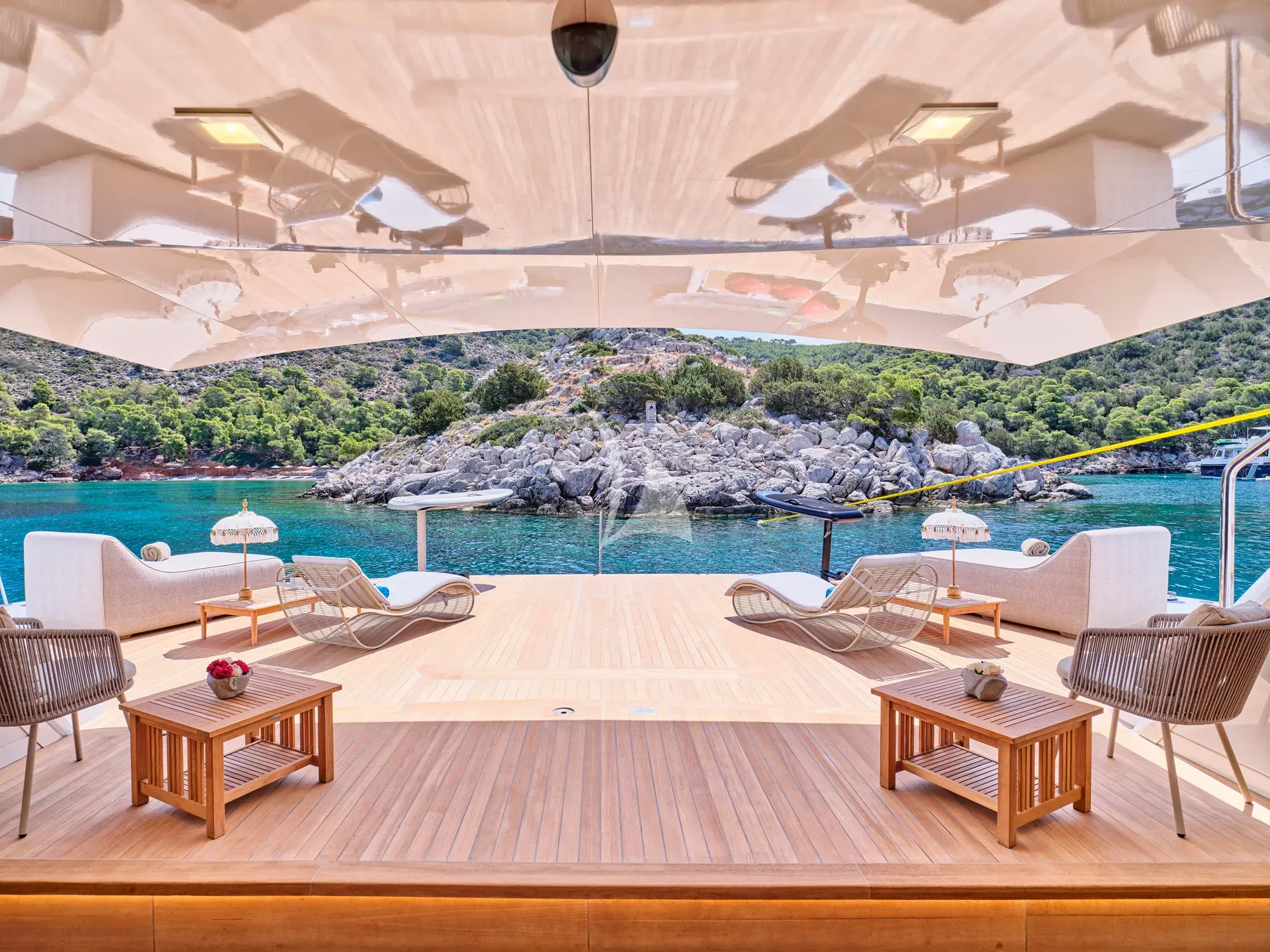 The yacht’s interiors are a study in opulence, harmoniously fusing state-of-the-art audiovisual technology with meticulously designed living spaces. Outdoors, a cinema on the sundeck and a hot tub encircled by a sunbathing area invites guests to relax and revel in the joys of open-air living.