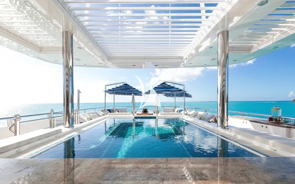 TITANIA has guest accommodation in 7 fantastic cabins, including two master suites, one on the main deck with a private jacuzzi bath and the other is an impressive newly installed second master suite on the upper deck with a panoramic sea view. TITANIA also has a VIP Cabin on the bridge deck plus four double cabins on the lower deck. There is an elevator going from the lower deck to the pool deck. She has a fully equipped gym on sun deck with fitness instructor and a beach club with sauna which can be converted into a night club. There is also a massage room & beauty salon with on board masseuse and beautician, glass gym with panoramic views and a personal trainer and large jacuzzi with swim-up bar. TITANIA is a certified RYA Training Centre and has two Jetski instructors able to issue jetski licences. TITANIA can host a maximum of 200 quayside guests for event charters.
