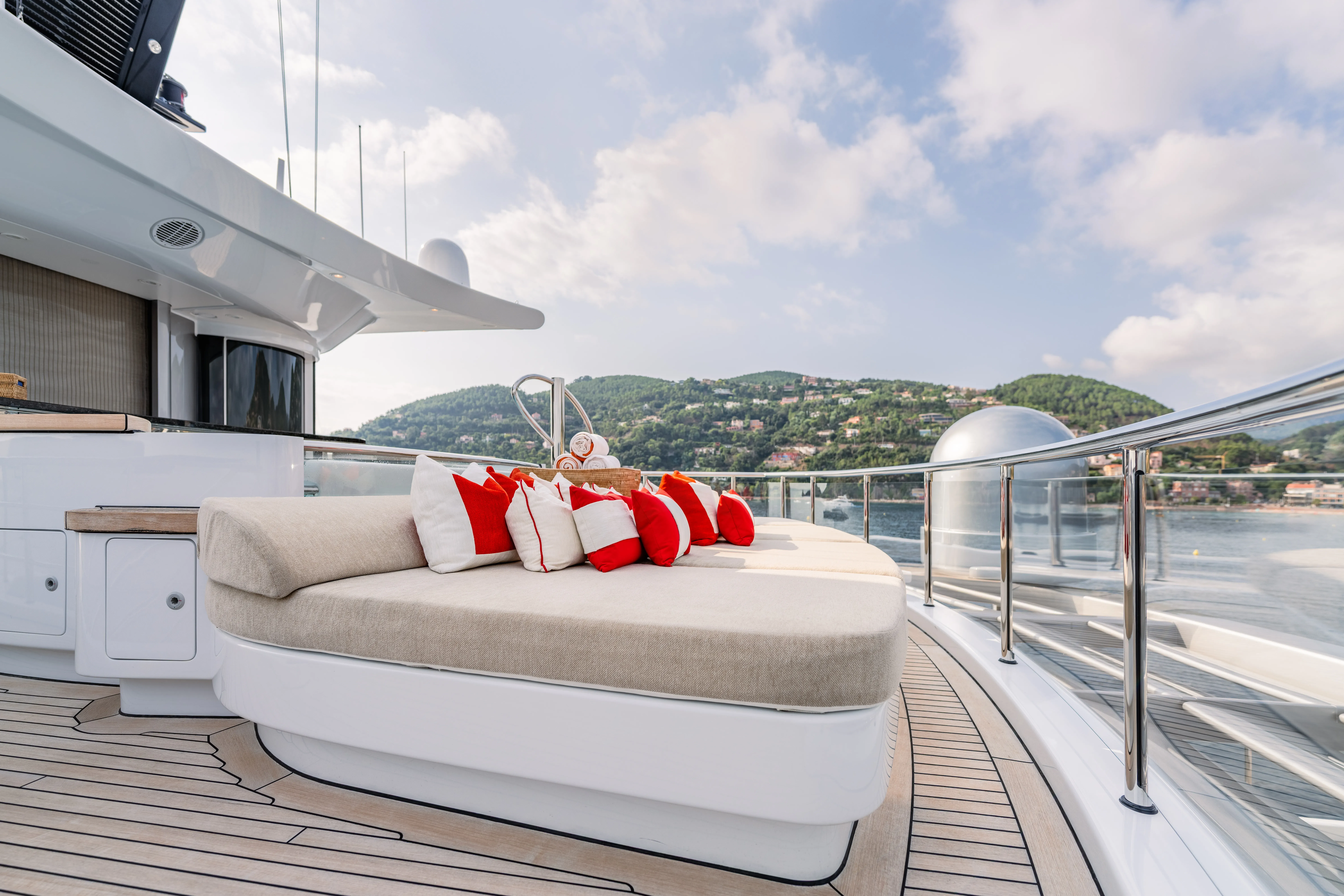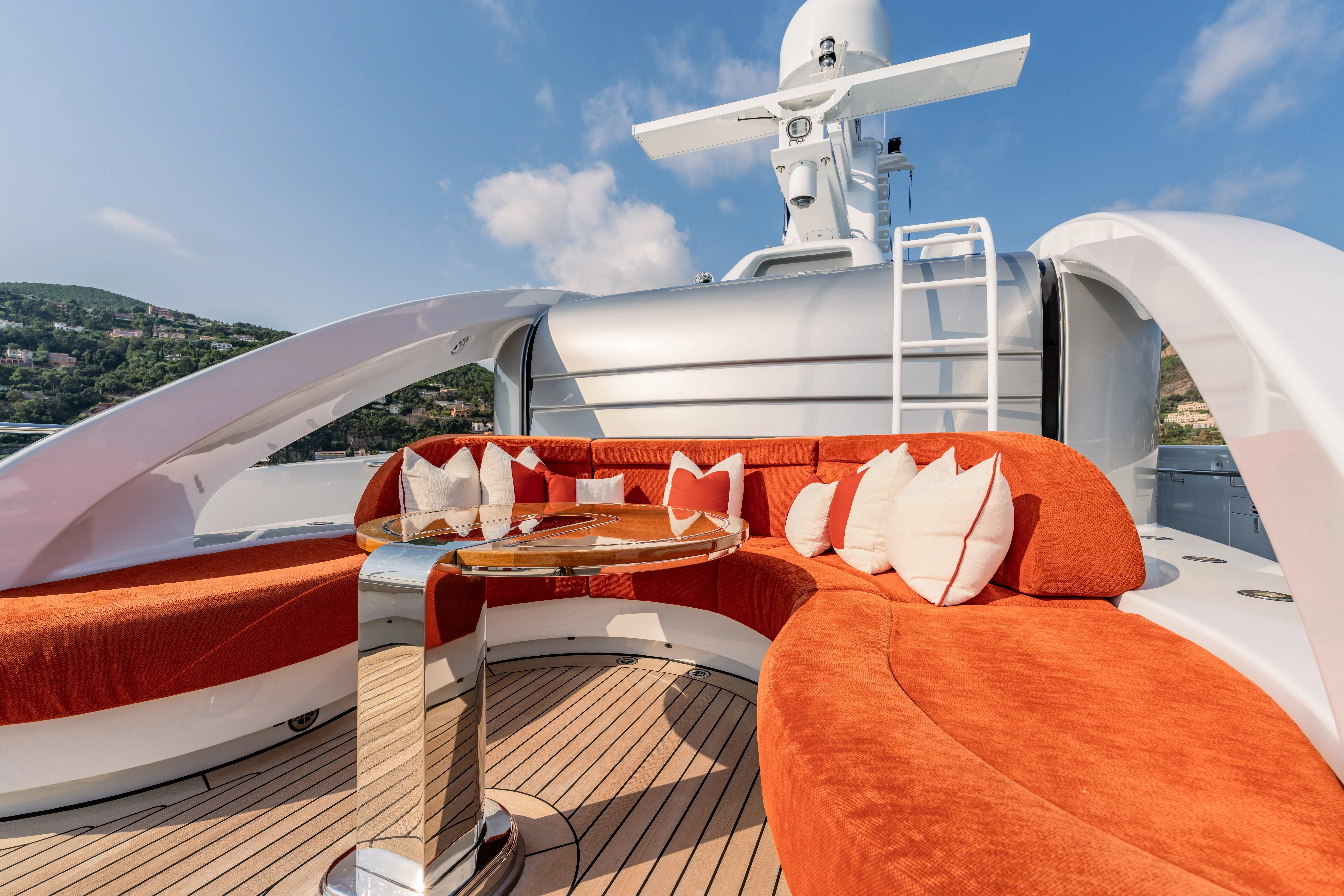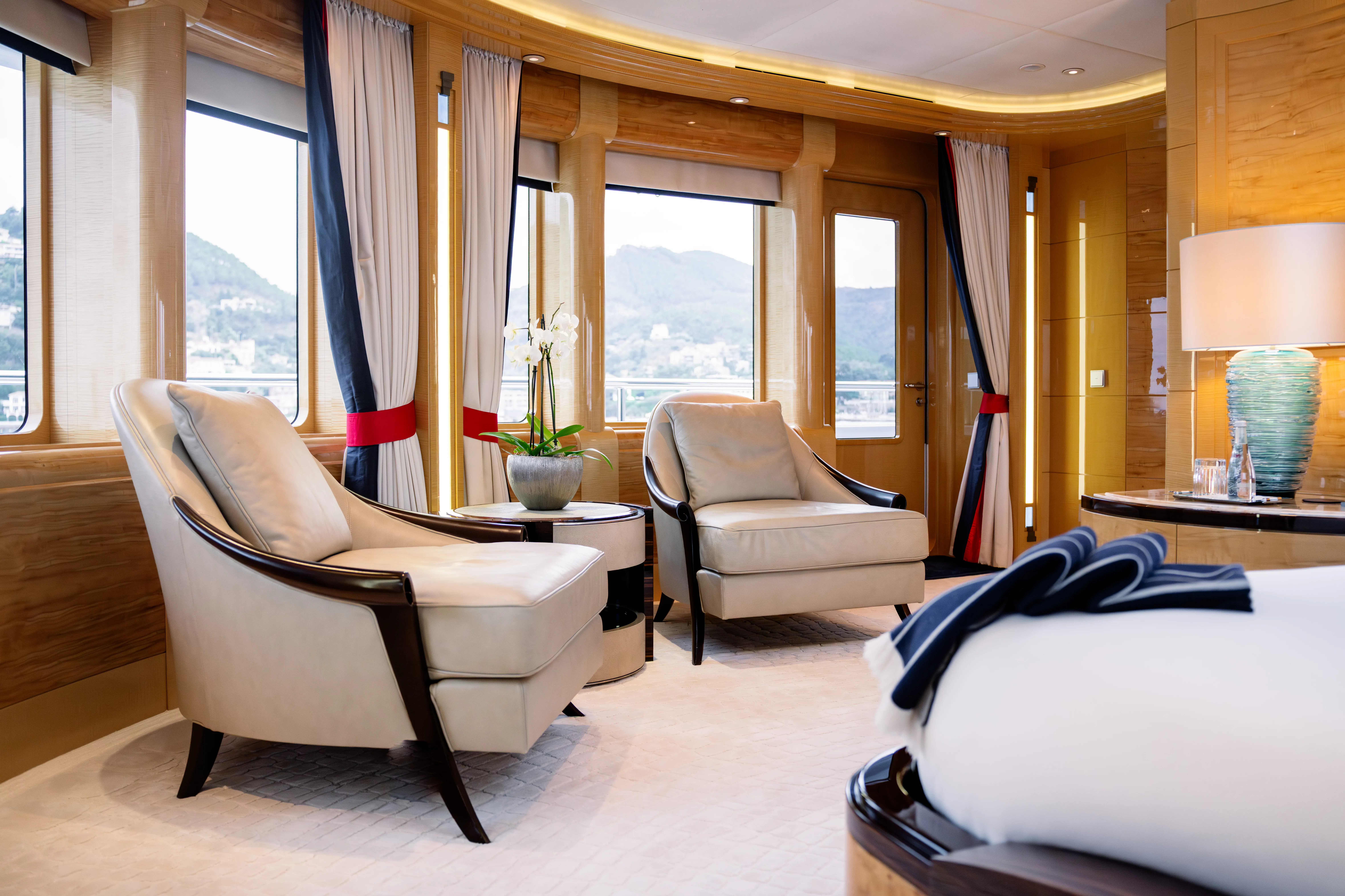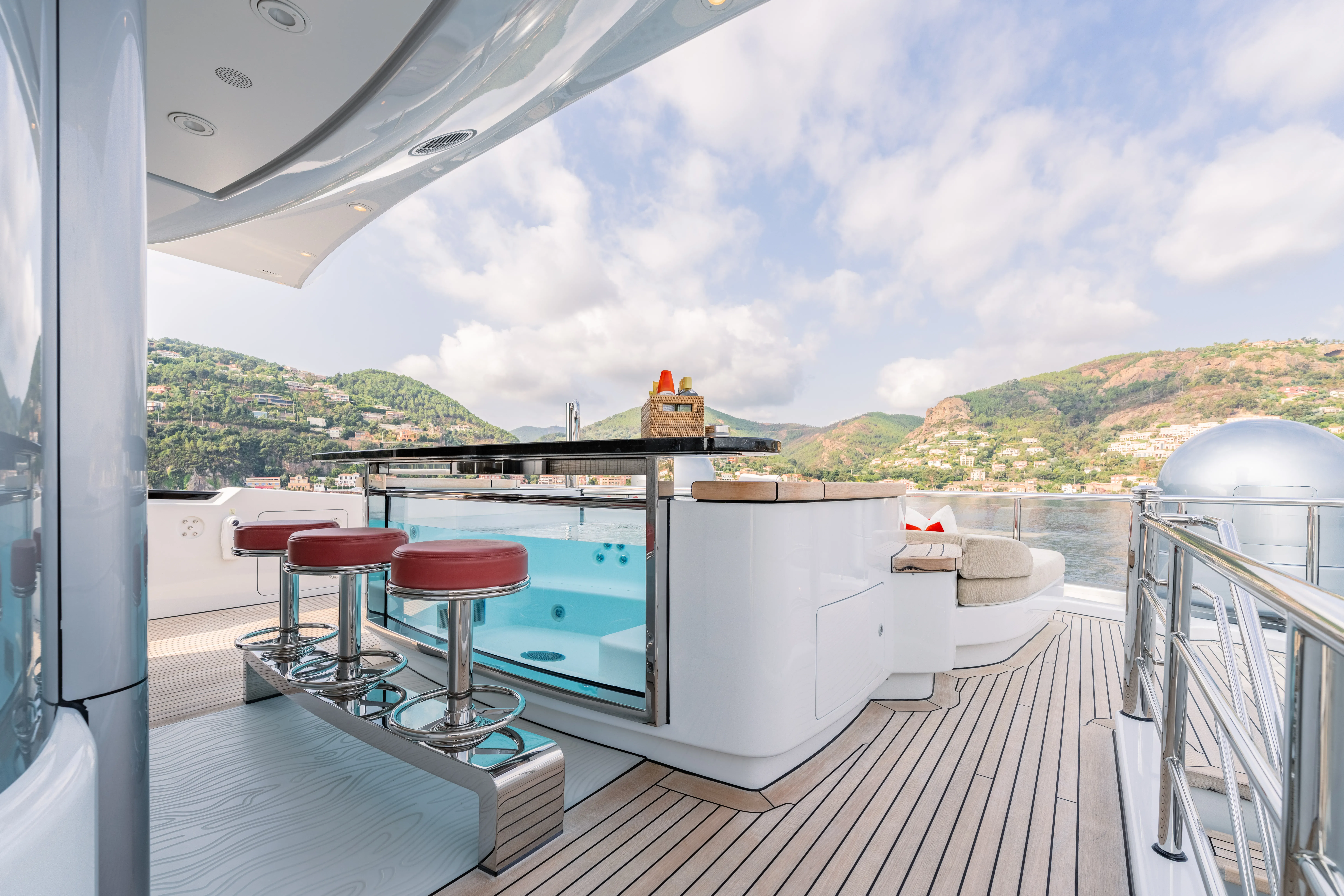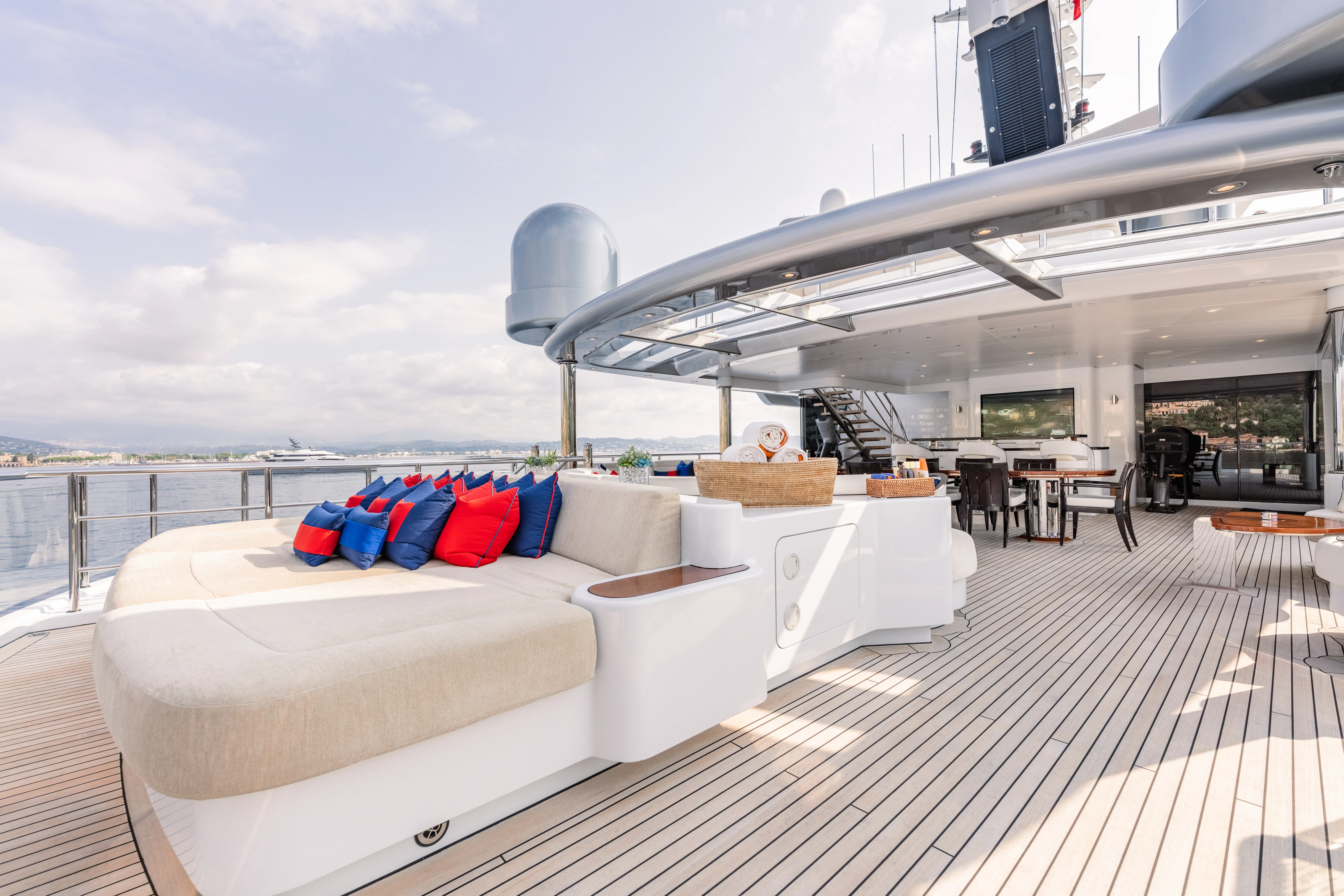 A Northern European build of exceptional quality, she offers the volume of a 70–75m yacht within a more flexible 60m frame, granting access to intimate anchorages without sacrificing space or comfort. She hosts 12 guests in 7 cabins, including a stunning Master Suite on the Owner’s deck with a 180° view, private terrace, and his-and-hers bathrooms. Additional guest cabins are found on the main deck. Amenities include a cinema with reclining chairs, open-air gym, full spa bar, multiple lounges, and a jacuzzi on the private Owner’s deck. The bridge and sundecks are designed for entertaining, with dining for 12, a spa pool with waterfall, and expansive seating areas. A central circular elevator connects all decks. Led by seasoned Captain Dean Pilatti, with Chef Dean Harrison and an expert crew, ARIENCE continues to impress as one of the finest yachts in her class.