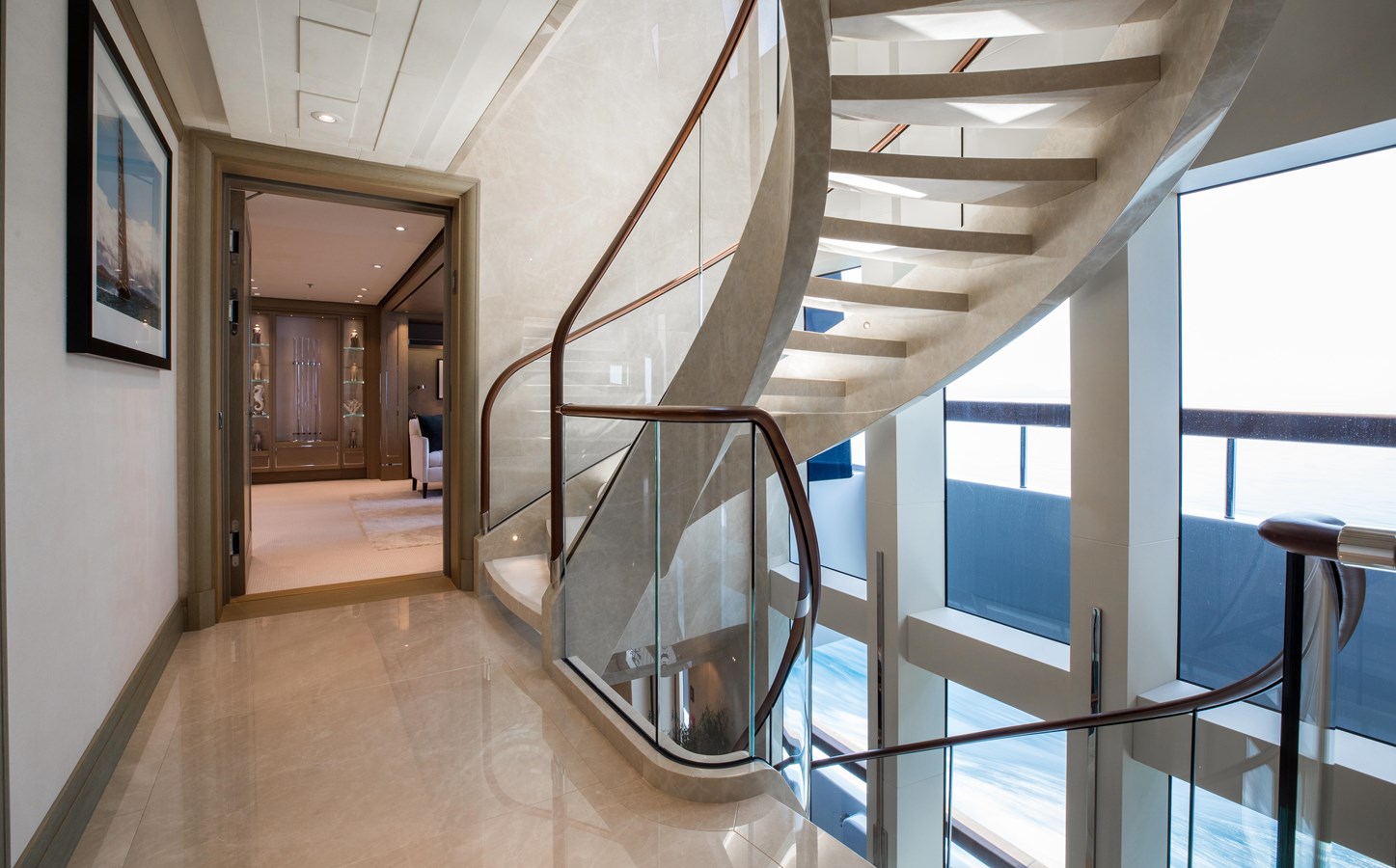 Motor Yacht HAMPSHIRE can accomodate 12 guests in 12 cabins, all looked after by a crew of 19. Her interior is the work of Harrison Eidsgaard.